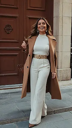 **Paragraph 1:** Hey there, fashion friends! Forget frumpy November sweaters ‚Äì check out this awesome outfit! It’s all about effortless style, perfect for those chilly days when you want to look put-together but still feel comfy. Imagine: you’re strolling through town, maybe grabbing a latte (pumpkin spice, of course!), and suddenly everyone’s admiring your killer camel coat and those seriously chic white pants. It’s the kind of outfit that says “I woke up like this (but secretly spent five minutes choosing the perfect belt).”
