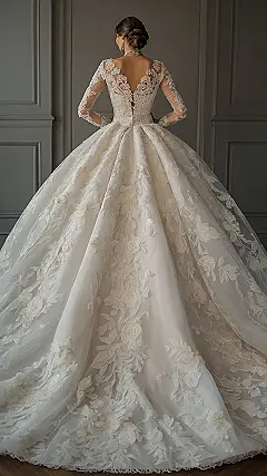 Thinking about dress shopping? This long dress has got you covered, literally! With all that gorgeous lace and the train that goes on forever, you’ll be turning heads and maybe even tripping a few unsuspecting guests (oops!). But hey, if you’re gonna make an entrance, make it a grand one, right? Plus, it’s got sleeves, which means you can skip the arm day at the gym before the big day. Win-win!