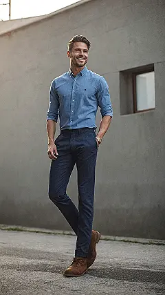 This guy’s rocking a shirt outfit that just screams “I’ve got things handled, but also I’m probably thinking about pizza.” That light blue button-up is practically a superhero cape for casual cool, with the sleeves rolled up like he’s ready to ace a presentation or maybe just perfectly flip a pancake. It’s the kind of shirt that makes you look smart enough for a parent-teacher conference but chill enough to win a staring contest with your dog. Plus, that color is so refreshing, it’s like a cool breeze on a hot day – definitely no fashion sweat here!