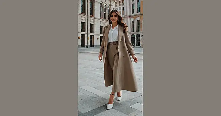 The woman in the photo is rocking a stylish outfit that screams “I mean business!” Her long, beige trench coat is like a superhero cape for the office. It’s got pockets for all your important things, a belt to make you feel powerful, and a classy look that will make everyone take notice.