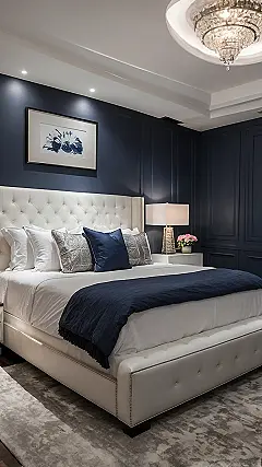 But hold up, the king bed isn’t the only star of this show! Check out those deep navy walls, making the whole room feel super cool and sophisticated, like you’ve stepped into a secret VIP lounge instead of just a bedroom. And that sparkling chandelier? It’s practically screaming, “I’m fancy, but also, please nap here!” With the sleek nightstands, elegant lamp, and even a little vase of flowers, this isn’t just a place to sleep; it’s a whole mood. You might feel so regal here, you’ll start demanding breakfast in bed (and maybe a personal chef!).
