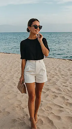 Who says vacation outfits for women have to be all about sarongs and sandy swimsuits? This look is totally owning the ‘beach chic’ game! Picture this: you’ve finally landed your dream vacation, and you’re not just there to swim; you’re there to *slay*. Those perfectly tailored white shorts and breezy black top are practically screaming, ‘I’m on vacation, and yes, I absolutely planned this outfit for maximum photo-readiness!’ It’s the perfect mix of relaxed beach day and ‘I might grab a fancy mocktail later.’