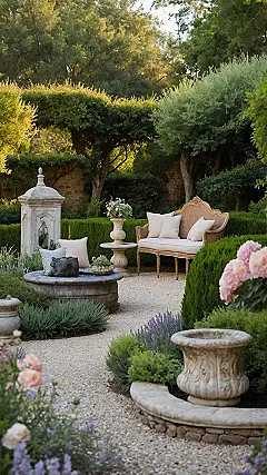 Stepping into this French country garden is like hitting the refresh button on your brain, but way prettier than your phone screen. You’ve got this epic fountain in the middle, probably whispering ancient secrets (or just wondering when someone will toss a coin for good luck). Those winding gravel paths look like a secret map, leading you past perfectly trimmed hedges and flowers that clearly got the memo about looking fabulous. It’s the kind of place where you half expect a tiny, impeccably dressed squirrel to offer you a croissant, or maybe a snail to challenge you to a slow-motion race. Definitely not your average backyard, unless your backyard has a full-time glam squad for its plants.
