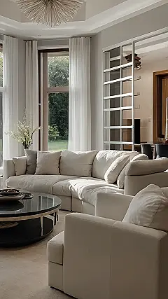 This living room is giving us major “I wish I lived here” vibes! It’s like a magazine spread come to life. The huge, comfy-looking sectional couch screams “come relax and chill,” and all the white and neutral colors make the space feel so peaceful. Plus, those big windows with the sheer curtains make it feel super bright and airy. Even the plants and the mirror add a touch of elegance without being too fancy.