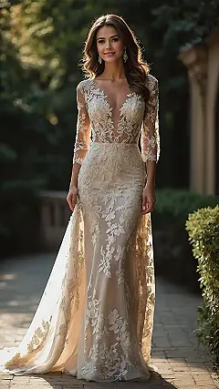 Alright, if you’re scrolling through the latest wedding guest outfits, prepare to have your jaw drop! This dress right here is like if a fairytale decided to walk into a party. With all that intricate lace and the way it seems to glow, you might accidentally convince everyone *you’re* the one saying ‘I do’! It’s gorgeous, glamorous, and definitely makes a statement. Just be ready for everyone to ask for a selfie with you, thinking you’re about to star in the next royal wedding.