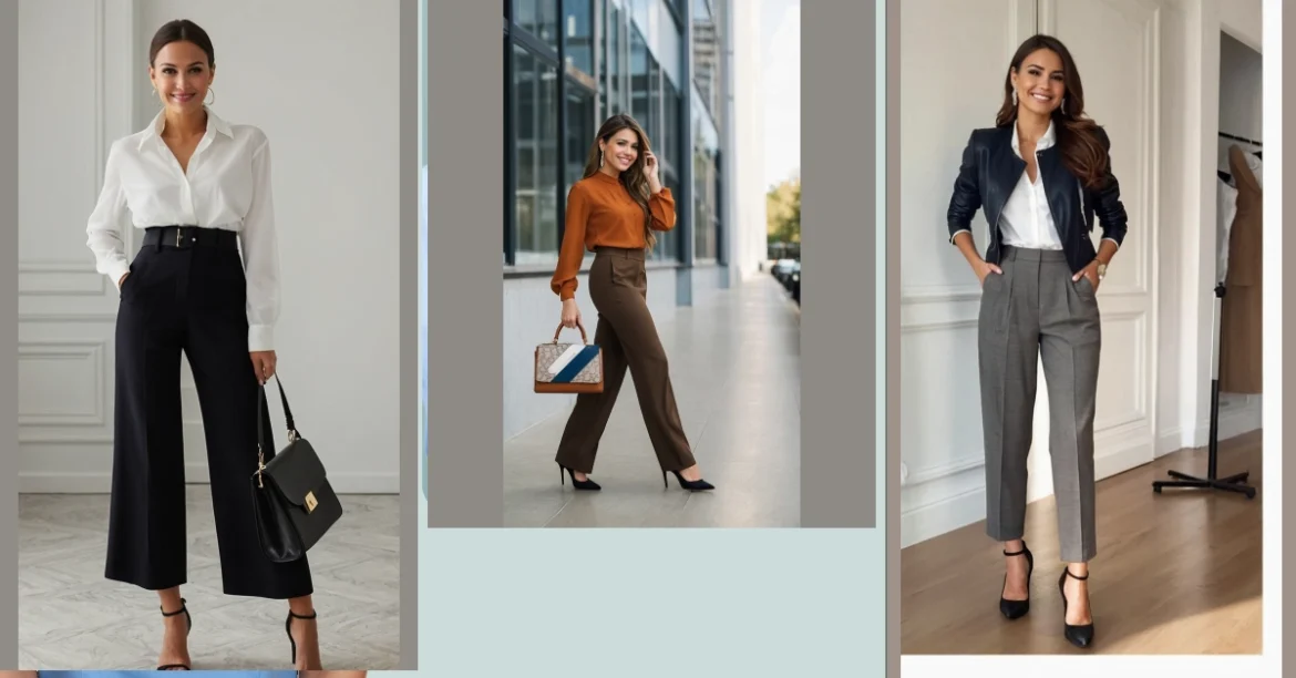 This picture shows a young professional rocking an amazing office outfit! Her burnt orange blouse is totally boss-lady chic, and those brown pants? They’re the perfect blend of professional and seriously stylish. It’s the kind of outfit that screams “I’m ready to conquer the world…and maybe grab a latte afterward.” That handbag is super cute too; it’s the perfect accessory to complete the look. Imagine showing up to your first internship or job interview looking this confident and put-together!