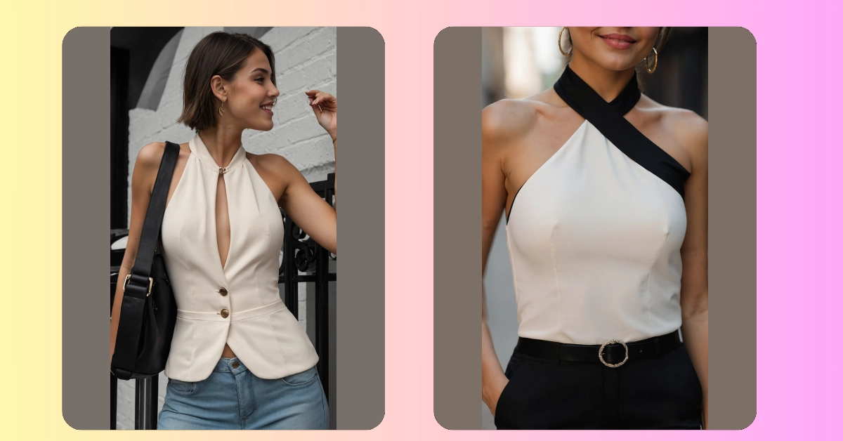 Adding those sleek black pants and that super cool gold button means this outfit isn’t just a top, it’s a whole vibe! It’s like the outfit is saying, “I’m ready for anything from a fancy school awards night to impressing my crush without even breaking a sweat.” And that little white clutch? It’s not just for holding your phone and lip gloss; it’s practically a shield of chicness! You’ll be rocking this halter top women outfit so confidently, people might just ask for your autograph, or at least where you got your amazing style.