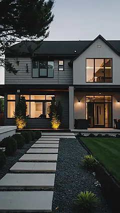 This modern suburban house is seriously stylish! Just look at it glowing in the twilight – it’s like something out of a movie. The dark gray siding gives it a cool, sophisticated vibe, but the warm lights inside make it feel cozy and inviting. It’s got all the modern features you’d expect – big windows to let in tons of light, a charming little porch perfect for sipping lemonade, and even a stone walkway that looks like it leads straight to a fairy tale. Who wouldn’t want to have a sleepover here?