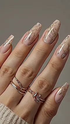 The best part? Not every nail is going full Midas touch; one even gets a chill, plain nude moment, like it’s taking a breather from all the glittery fame. This combo of subtle elegance and bold golden art is what makes them so modern and awesome. You’ll be tapping your fingers and accidentally sparkling, probably making your homework look a little more glamorous too!