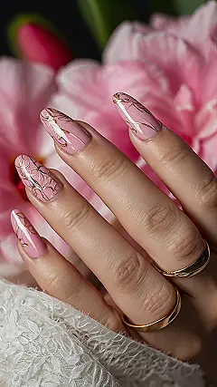 You might have been expecting nails so bright they’d practically glow in the dark, screaming ‘hot pink!’ louder than a pop concert. But surprise! These beauties took a slightly more elegant, yet still totally fabulous, detour. Instead of neon, they’re rocking a dreamy soft pink, like the prettiest spring blossom you’ve ever seen, all dolled up with intricate golden swirls. It’s like they decided, ‘Why be super loud when you can be quietly stunning and still totally steal the show?’ These nails are definitely giving off ‘I’m sophisticated and effortlessly cool’ vibes, which, let’s be real, is the ultimate style goal.
