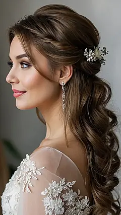 Let’s be real, summer weddings are all about staying cool and looking amazing. That’s why this ‘do is perfect, the elegant clip adds a touch of sparkle without being over the top. Plus, think about all the awesome photos you’ll get with those curls catching the sunlight – total Instagram goals! It is the ideal blend of elegance and ease, so you can concentrate on the important things, such as enjoying your cake and not tripping down the aisle.