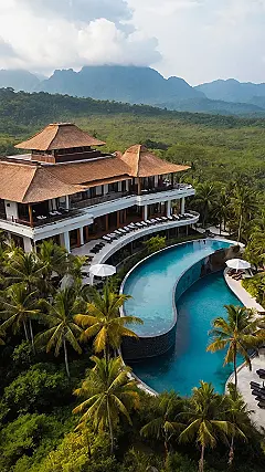 Forget about homework and early morning alarms for a second, and just look at this place! This tropical hotel looks like something straight out of a secret agent movie mixed with a super luxurious treehouse. With that incredible thatched roof architecture nestled right in the middle of a vibrant green jungle, you’d probably spend half your time trying to spot a sneaky parrot or a mischievous monkey swinging by. It’s the kind of spot where your biggest decision of the day is whether to take a selfie with a palm tree or simply soak in the pure, unadulterated chill vibes.