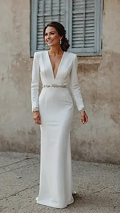 Check out this bride, looking absolutely radiant and probably wondering if she can wear this gorgeous dress to the grocery store next week! That sleek white gown, with its super chic deep V and sparkling belt, screams ‘elegance’ but also whispers ‘I can actually breathe and dance without turning into a stiff mannequin.’ When a dress like this is crafted from sustainable organic cotton, it’s basically giving you a soft, planet-friendly hug all day long. No scratchy materials trying to steal your spotlight; just pure comfort so you can focus on smiling for photos and maybe even doing the Macarena without fear of a fashion disaster!