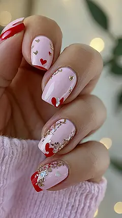 These nails are seriously heart-stopping! Look at those adorable little red hearts and sparkly pink designs – perfect for showing off your Valentine’s Day spirit. They’re like a mini-celebration on your fingertips, way more fun than just plain red, and they’d totally impress your friends (or maybe even your crush!). Imagine showing these off at the Valentine’s Day dance – you’ll be the ultimate nail-fashion queen!