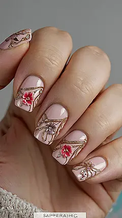 These nails are on a whole other level! Seriously, they look like miniature fairy gardens exploded onto fingertips, complete with delicate pink and red flowers, shimmering gold vines, and tiny gems sparkling like crazy. They’re so detailed, you might wonder if the person who did them used tweezers and a magnifying glass the size of a pizza. They scream ‘summer glam’ and probably make simple tasks like opening a can of soda feel like a major event, but hey, looking this fabulous is worth it, right?