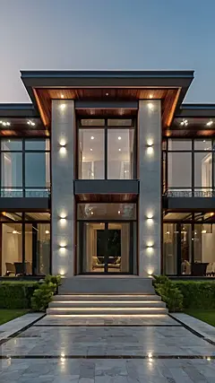 Check out this fancy villa! It’s like someone took a time machine to the past and then gave it a serious upgrade. You’ve got the classic shapes and fancy details that scream “old money,” but then you see the sleek lights and super-groomed bushes, and you know it’s not your grandma’s mansion. It’s like a history project that suddenly got Wi-Fi and a killer sound system.