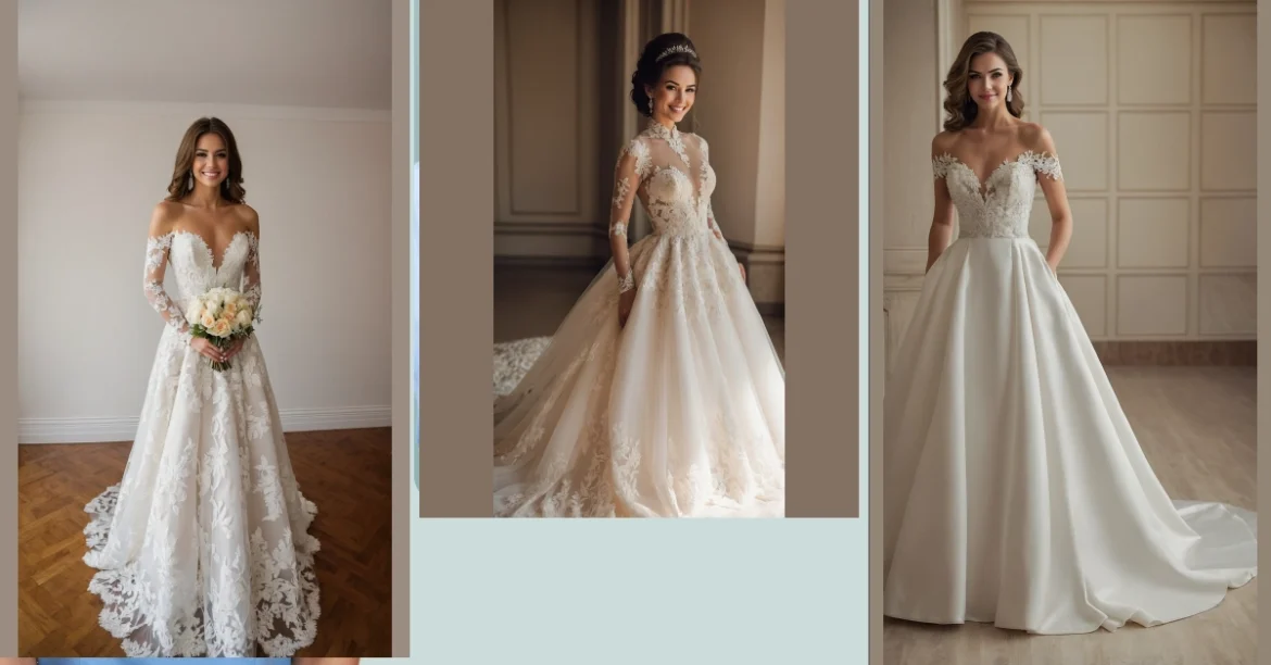 Check out this absolutely stunning wedding dress! Our model here looks like she just stepped out of a fairytale, smiling big with that gorgeous updo and sparkly earrings. The dress itself is a showstopper, with its flowy white skirt and those super elegant off-the-shoulder lace sleeves. The way the lace bodice hugs her figure and dips slightly into a stylish V-shape is actually what fashion folks call a ‘Basque waist’ – it’s all about giving you that classic, snatched-in silhouette before the skirt flares out beautifully. It makes you look extra graceful, like you’re floating down the aisle, probably thinking about cake.