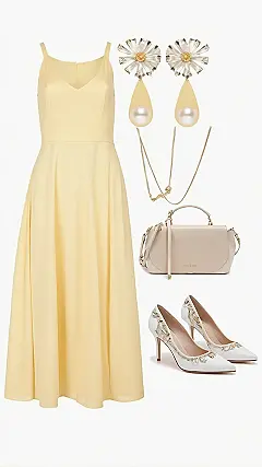 For styling this creamy dream, our friend here totally nails it with those sleek nude heels and that matching little handbag. It’s like she’s saying, ‘Hey world, I’m here, I’m fabulous, and I didn’t even have to try that hard!’ The neutral accessories let the happy yellow really pop, making you look totally put-together without having to coordinate a million different colors. Just add a big smile, and you’re basically a walking, talking ray of stylish sunshine ready to conquer the day!