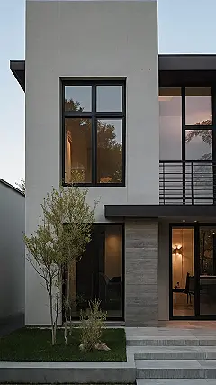 This house is like a minimalist’s dream! It’s all sleek lines, sharp angles, and a color scheme that screams “sophisticated.” The black windows and door frames stand out against the light-colored walls, and the whole thing just feels clean and modern. It’s almost like the house is saying, “I don’t need a lot of clutter to be beautiful.” And you know what? It’s totally right!