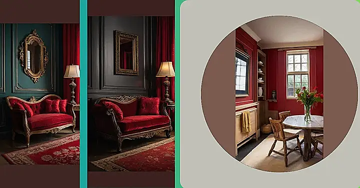 This room is seriously rocking the red! Imagine having dinner here – surrounded by rich, crimson walls that practically hum with cozy vibes. The flowers in the vase are like a burst of sunshine, adding a pop of color that prevents things from feeling too dramatic. It’s like a secret club for people who appreciate sophisticated redness, and anyone can join! That comfy-looking rug adds just the right touch to make sure it isn’t too much like a vampire’s lair.