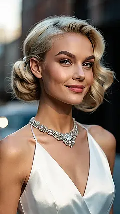 Seriously, who needs a mile-long veil when you’ve got this much style? This look is all about effortless elegance, and it shows off your face instead of hiding behind a mountain of hair. Plus, can we talk about those accessories? Sparkly earrings and that killer necklace? You don’t need a ton of hair when you’ve got the bling to bring the drama! So, if you’re a short-haired bride, take notes! You can be absolutely gorgeous without sacrificing your signature style.