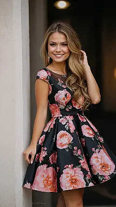 Forget stressing about what to wear, because this dress just walked in and stole the show! Those huge, happy pink flowers blooming all over a classic black background? It’s like a secret garden decided to throw a party, and you’re the guest of honor at Homecoming. You’d totally be ready to hit the dance floor, maybe even bust out a move or two that you *think* looks cool, while secretly hoping you don’t step on anyone’s toes. Plus, that little sheer detail near the neck? Super stylish without being too much – perfect for feeling awesome and not sweating the small stuff!