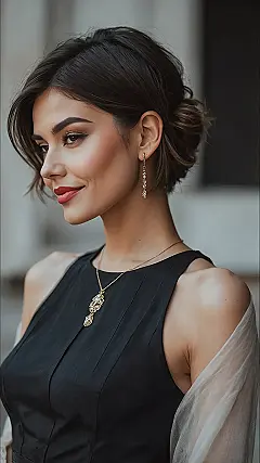 The woman in the picture looks absolutely ready to conquer the world, or at least ace that pop quiz you forgot to study for! Her smile is so confident, and check out that perfectly styled hair – it’s got that chic, “I woke up like this, but then spent five minutes making it look even better” vibe. While she’s rocking a super elegant updo, those lovely face-framing pieces and the overall length hint at the magic of a bixie cut. It’s like the superhero of short hairstyles, giving you the best of a bob and a pixie without having to choose just one. Who needs a magic wand when you have a killer haircut that transforms your look from “just rolled out of bed” to “ready for a magazine cover”?