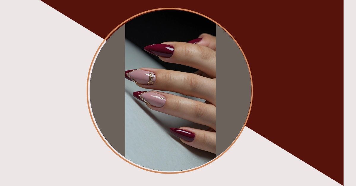 Check out these seriously sharp nails, giving off major ‘don’t mess with me’ energy! That deep, glossy burgundy practically screams confidence, while the lighter nude base keeps things super chic and balanced. And those pointy tips? Forget your typical coffin nail; these stiletto beauties are like tiny, elegant weapons ready to conquer the day. You might feel like a secret super spy just by wearing them, all while sparkling brilliantly with those fancy little gems.