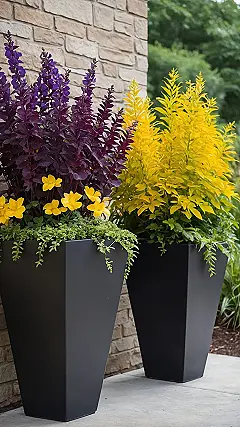 Check out these cool characters! They’re not into the whole ‘baking in the sun’ vibe; they prefer to chill out in the shade, looking absolutely fabulous while doing it. See the snazzy purple and bright yellow ones in their sharp black containers? They’re proving you don’t need endless sunshine to be the life of the party. These plants are basically the effortlessly cool kids who look great without even trying, happy to hang out where things are a little less, well, sunny.