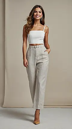 Check out this look! Those linen pants are basically the fashion version of chilling in a hammock, but make it stylish enough for, like, a fancy brunch or maybe just looking way cooler than everyone else at the mall. They’ve got that totally relaxed vibe, especially paired with a sharp top like that, making you look put-together without feeling like you’re squeezed into something stiff. Plus, linen is basically magic for keeping you cool when it feels like the sun is personally attacking you outside.