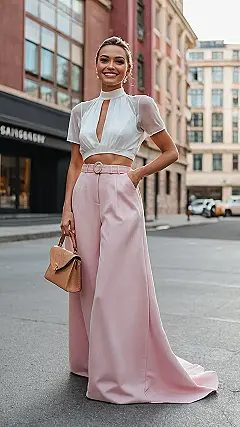 This outfit is seriously *pink-tastic*! Imagine strolling down a city street, feeling like a total boss in these fabulous wide-leg pants. The pale pink color is so effortlessly stylish, and paired with that cute little white crop top, it’s the perfect blend of classy and cool. It’s like a modern-day princess vibe meets a downtown fashionista—the best of both worlds! You’d definitely turn heads (and maybe even inspire a few pink-pant purchases!).