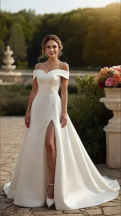 So, you’re thinking about wedding dresses, huh? This one gives off major fairy-tale vibes, but with a bit of a sassy twist! The off-the-shoulder thing is super elegant, and the little leg slit? It’s like a “Hey world, I’m getting married, and I look awesome!” kind of statement. This could be the dress if you want a mix of classic princess and modern bride.