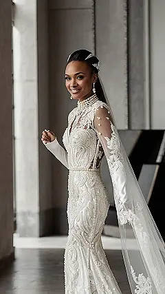 This wedding dress is like a fairytale come to life! Imagine yourself walking down the aisle, feeling like a princess in this gorgeous pearl-studded gown. It’s got all the sparkly details, long sleeves for a touch of elegance, and a beautiful flowy skirt that’s perfect for twirling (and maybe accidentally tripping over your own feet – but hey, it’s your special day!). The bride-to-be in the picture looks absolutely radiant, and you’ll definitely feel like a queen in this stunning dress!