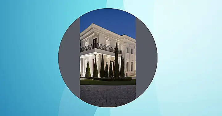 Check out this place! It looks less like a normal house and more like it just finished a history class project on Greek temples and decided to become one, complete with giant columns holding up the porch like it’s got some serious thinking to do. This is what they call a ‘neoclassical villa’, which basically means it’s trying really hard to look fancy and old-school, like it belongs in a historical drama. The tall, pointy trees lined up out front look like they’re standing guard, probably making sure no one forgets how important this house thinks it is, especially all lit up at night like a movie set.