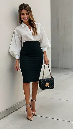 This outfit is like a secret handshake for grown-ups who secretly love fancy things but still want to be comfortable. Imagine you’re going to a super-important meeting (maybe to plan the next school dance!), but you also want to look effortlessly cool, like you just stepped out of a magazine. This crisp white shirt and sleek black skirt combo is the perfect mix of professional and stylish. Those golden shoes? They’re the cherry on top, adding just the right amount of “wow factor” without being too flashy. It’s the kind of look that says, “I’m here to get things done, and I look fabulous doing it.”