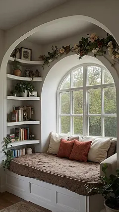 This reading nook looks so comfy, it’s practically begging you to ditch your homework and get lost in a good book. With that giant arched window, you can pretend you’re exploring magical forests even if it’s just your neighbor’s backyard. Plus, all those shelves mean you’ll never run out of stories to dive into, or at least places to stash your secret snack supply away from younger siblings. The soft cushions and pretty flowery decor just scream, “stay here and forget all your responsibilities for a bit!”