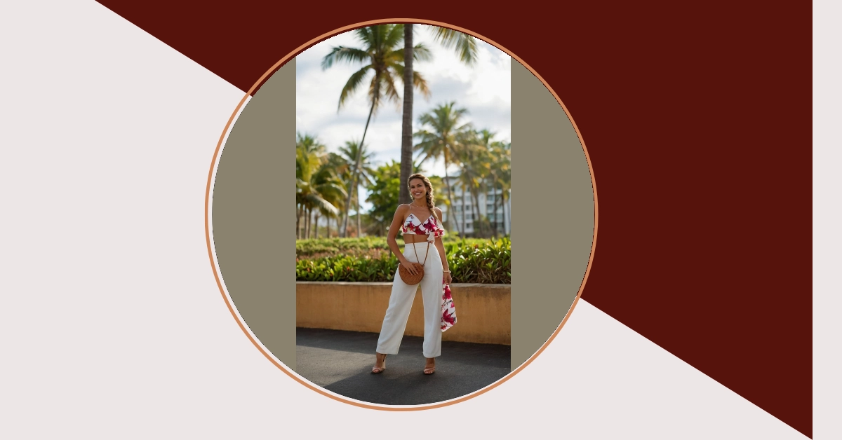 This picture is pure Hawaiian sunshine! Imagine yourself strolling along a palm-lined beach, feeling the warm breeze in your hair, and looking absolutely fabulous in this outfit. It’s the perfect blend of chic and relaxed—those white pants are seriously breezy, and that floral top? It screams “tropical getaway” without being too loud. Plus, that cute little straw bag is the perfect accessory to hold all your essentials, like sunscreen and maybe a pineapple. You’ll be the most stylish person on the island!