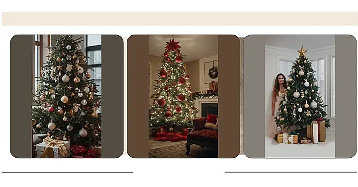 This Christmas tree is seriously next-level! Look at those gorgeous gold and silver ornaments, sparkling like a disco ball exploded all over a perfectly shaped pine. It’s so fancy, it makes even the presents underneath look a little shy. I bet it smells amazing, like pine needles and Christmas cookies! This is the kind of tree that would make even Scrooge crack a smile (maybe). And don’t even get me started on how perfectly coordinated the decorations are with that stunning dress.