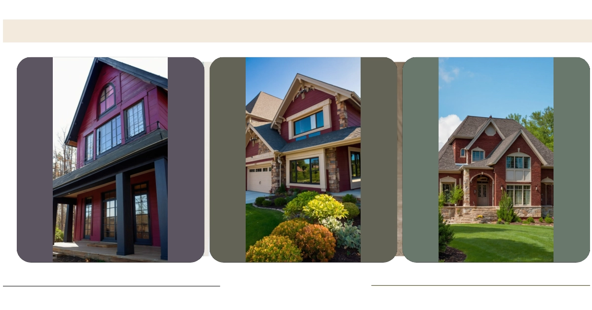 This isn’t your grandma’s red house! This place is seriously stylish. Imagine walking up to this gorgeous crimson beauty, with its fancy stone accents and those huge windows that look like they’re showing off the best backyard view in town. It’s like a fairytale house, but instead of a prince, it’s got a seriously impressive lawn and some super cool landscaping—all those vibrant colors really pop against the deep red. You could almost believe this house has its own secret garden, or maybe even a hidden gnome colony!