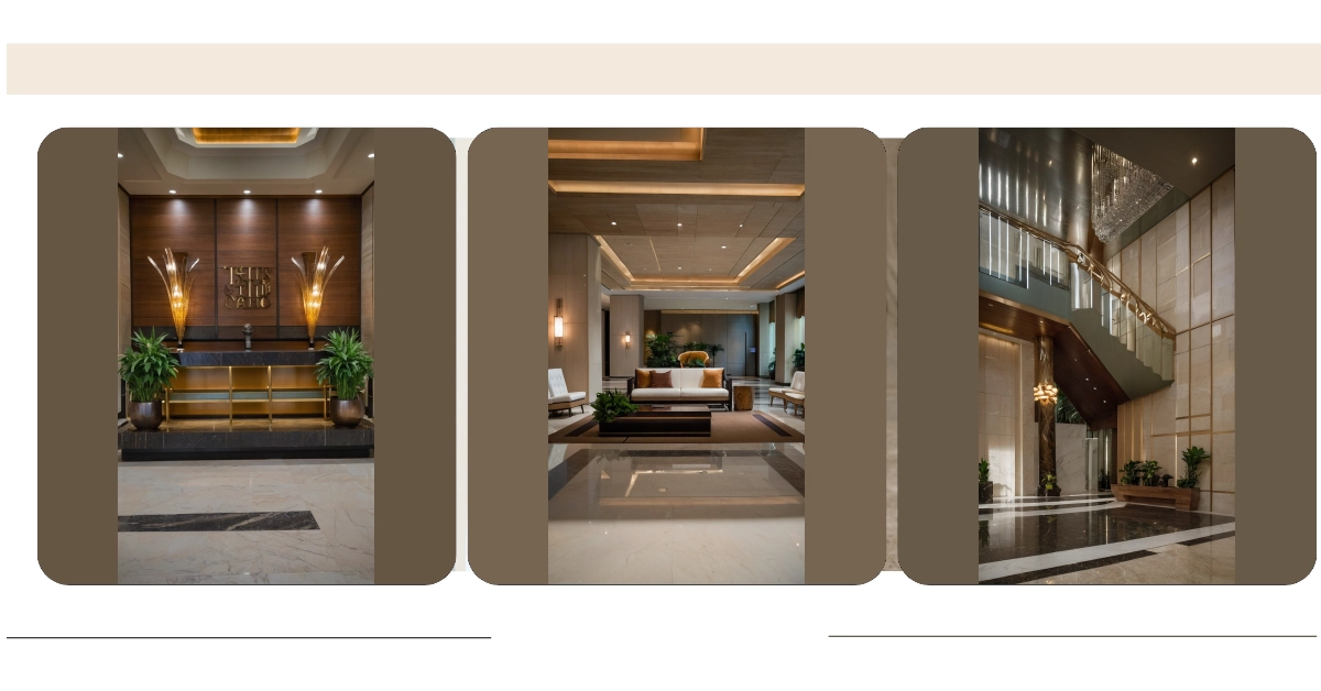 Wow, check out this lobby! It’s like stepping into a fancy art gallery, but way more comfy. That golden screen behind the sofa is totally amazing; it looks like a bunch of elegant, metallic plants grew right out of the wall. It’s so sparkly and stylish, you might forget you’re just waiting for your appointment or hanging out before heading somewhere else. The whole thing screams “sophisticated relaxation,” making you feel like a VIP, even if you’re just picking up a package.