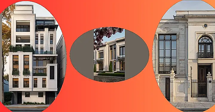 This “modern neoclassical” style is all about taking the best parts of the past and bringing them into today. The creamy stone and the symmetrical design make it look grand and sophisticated, but the large windows and simple door are totally modern. It’s not trying to be a replica of an ancient temple; it’s taking inspiration from the best of those designs and creating something new and exciting for the present day. It’s a little bit like a remix of a classic song – it keeps the original melody but adds some awesome beats and instruments!