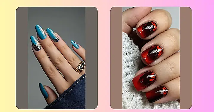 These nails are like a cozy winter night meets a fiery sunset! Imagine sipping hot cocoa by a crackling fireplace, but instead of marshmallows, you’ve got these gorgeous red and black ombre nails with little pops of orange – it’s the perfect blend of warmth and winter coolness. They’re totally chic and would make even the grumpiest snow monster crack a smile. Forget snowflakes; these are the hottest things on your fingertips this season!