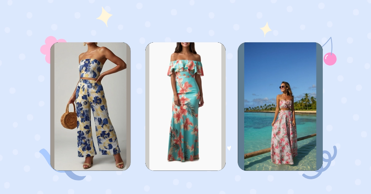 This picture screams “Hawaii vacation goals!” Imagine yourself strolling along a crystal-clear beach in a stunning floral outfit, the sun warming your skin, and the gentle ocean breeze playing with your hair. This two-piece wonder is perfect for a day of exploring hidden coves, chasing away the stress, and taking some seriously Instagram-worthy pictures. Forget about packing a million different outfits—this one’s got you covered, from beach bum to sunset cocktails. It’s basically the epitome of what women’s Hawaii outfits should be: effortless, stylish, and ready for adventure!