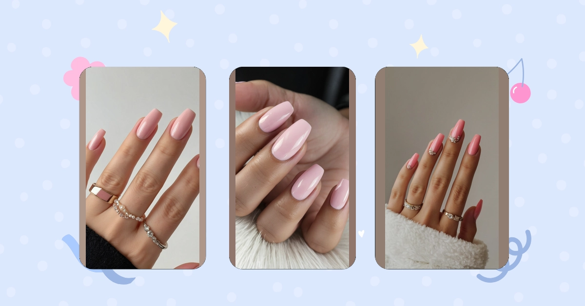 These nails are totally giving me Valentine’s Day vibes, but in a super chill, not-too-over-the-top kind of way. That perfect shade of pink is like a whisper of romance – not screaming “LOOK AT ME!” It’s sophisticated, and with those gorgeous gold rings, it’s like a subtle “I’m ready for some chocolate and maybe a cute movie” kind of look. Seriously, I’m obsessed!