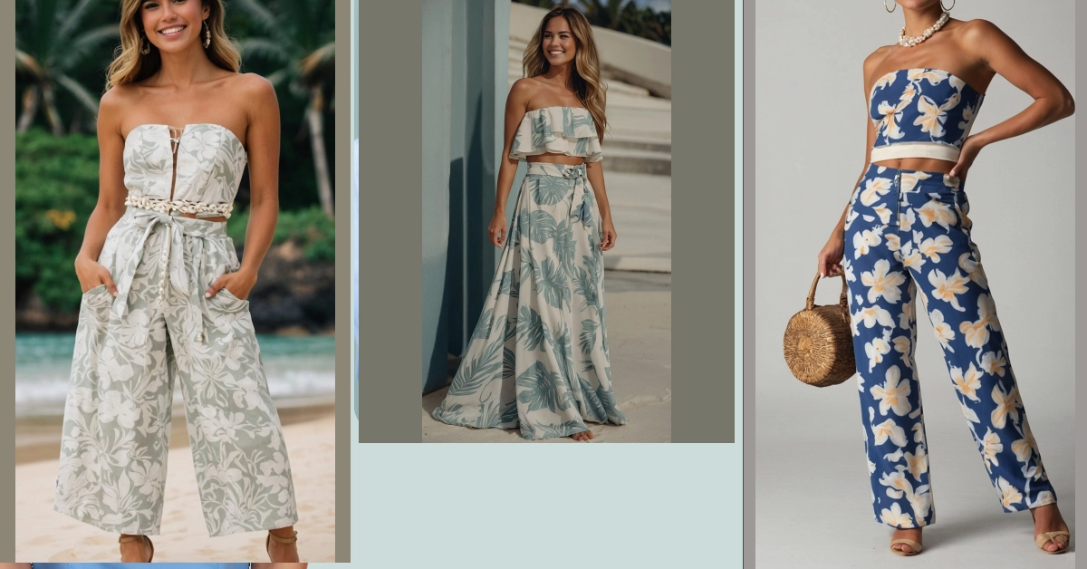Seriously, who wouldn’t want to rock this? It’s the perfect blend of relaxed and refined. The wide-leg pants are super flattering and comfortable, while the strapless top adds a touch of elegance. Plus, the shell and pearl accents are just the right amount of subtle island flair – no need for a coconut bra here! Just pure Hawaiian vibes in one amazing outfit.