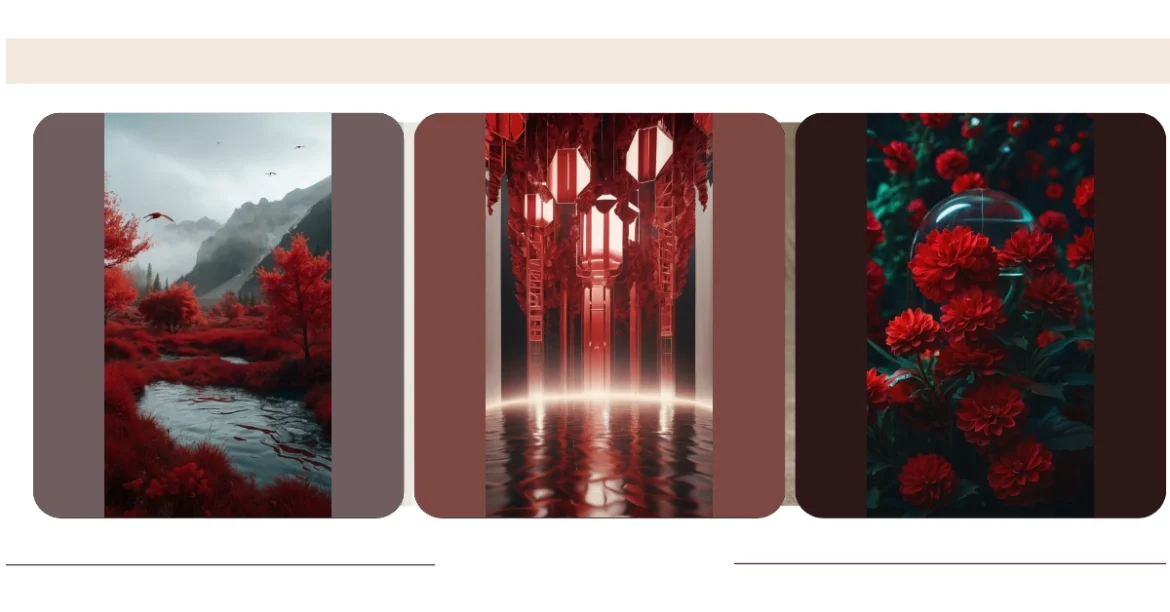 Imagine a world painted entirely in shades of red, like someone accidentally spilled a giant pot of cranberry juice across a breathtaking mountain range! That’s pretty much what this picture looks like – a surreal landscape with fiery red trees and grasses lining a calm river. It’s so vibrant, you almost expect to see a flock of crimson birds wearing tiny red wallpaper hats flapping their way through the scene. Maybe they’re heading to a red-themed party?