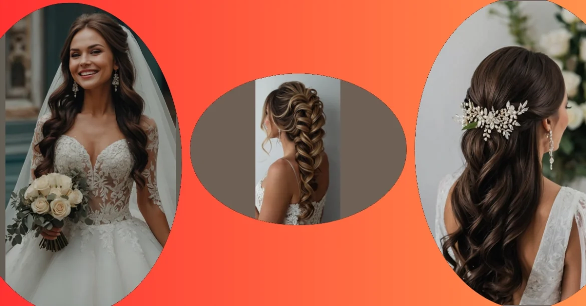 This hairstyle is seriously stunning! Imagine walking down the aisle looking like a total princess – that’s the vibe you’ll get with this half-up, half-down bridal hairstyle. The top is elegantly pulled back, like a stylish crown, while the bottom cascades down in gorgeous, bouncy waves. It’s the perfect mix of sophisticated and fun – you’ll feel like a celebrity, but still totally you!