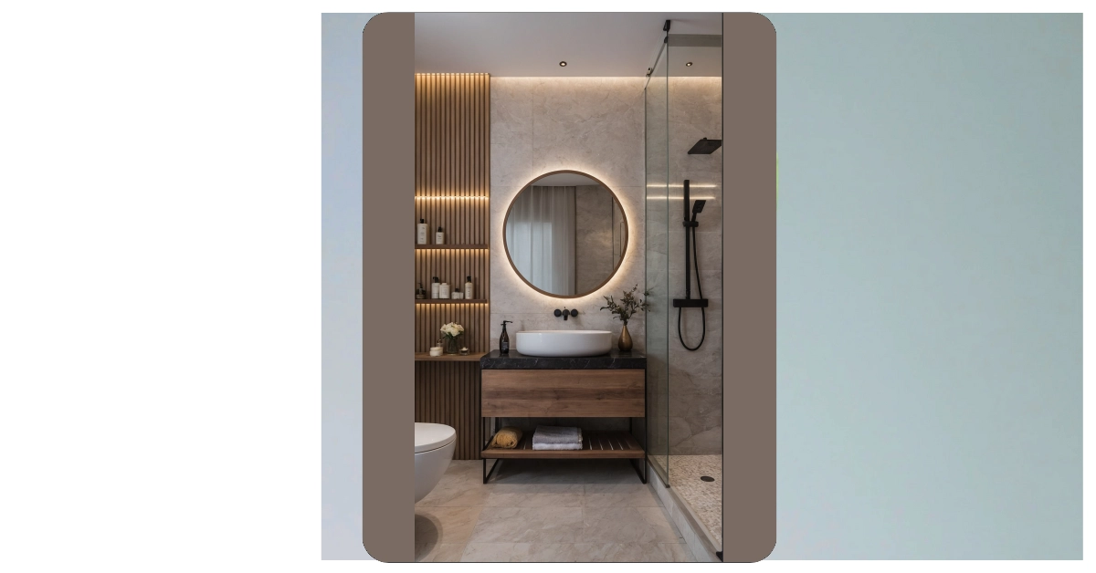 And get a load of that shower! With its clear glass door and awesome black fixtures, it looks so stylish you might actually forget you’re just washing off the day’s drama. Those cool wood panels aren’t just for looks; they’ve got hidden lights and clever shelves for all your potions and lotions, meaning everything has its own spot. No more tripping over shampoo bottles or hunting for a clean towel! This whole bathroom design is so smart and polished, it might just inspire you to actually keep things tidy… for at least a day, right?