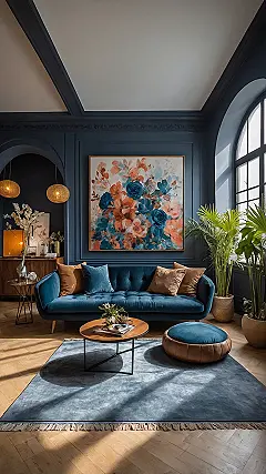 And seriously, those walls are rocking that deep blue! It’s not just paint; it’s a whole mood. It makes the room feel cozy and dramatic at the same time, like a secret hideout for sophisticated people (or just for lounging on that awesome blue sofa). Choosing a wall color this bold is like giving your room a superhero cape. It makes everything else pop, especially when you add a massive, show-stopping wall painting like the one above the couch.