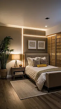 So, you’re tired of your bedroom looking like a tornado went through your closet? This room is like a spa retreat, but without the awkward small talk while getting a facial. The subtle lighting and the big leafy plant practically scream “chill vibes only.” It’s the kind of place where you could actually finish that book you’ve been meaning to read, or maybe just nap—because, let’s be real, napping is a talent we should all cultivate.